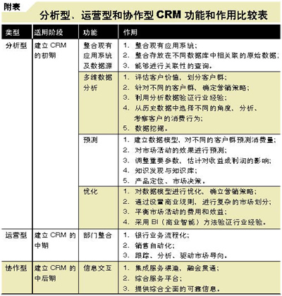 在上述目標(biāo)下,有什么類型的產(chǎn)品可供選擇呢?對銀行來說,有分析型、運營型和協(xié)作型3類CRM,而這3類CRM也有著很大差別,對于有不同需求的銀行需要有不同的選擇。下面詳細分析這3類CRM。