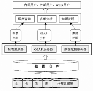 數(shù)據(jù)倉庫系統(tǒng)一般包括三層結(jié)構(gòu):數(shù)據(jù)獲取層、數(shù)據(jù)存儲層、數(shù)據(jù)輸出層。數(shù)據(jù)獲取層通常采用弱耦合方式與業(yè)務(wù)系統(tǒng)數(shù)據(jù)庫相連,通過對業(yè)務(wù)系統(tǒng)數(shù)據(jù)進行抽取、轉(zhuǎn)換和加載后,導(dǎo)入數(shù)據(jù)倉庫;數(shù)據(jù)存儲層完成對數(shù)據(jù)倉庫系統(tǒng)中數(shù)據(jù)的存儲和管理,為了便于對海量數(shù)據(jù)的管理,總是把數(shù)據(jù)以一定的規(guī)則組織起來,如何從邏輯和物理上去組織數(shù)據(jù),是數(shù)據(jù)倉庫建設(shè)的重要步驟;數(shù)據(jù)的輸出層與OLAP服務(wù)器、數(shù)據(jù)挖掘服務(wù)器相連,對數(shù)據(jù)倉庫中的數(shù)據(jù)進行多維分析和挖掘。