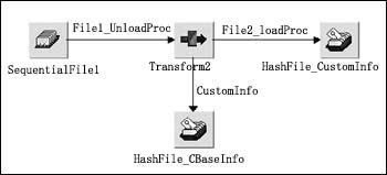 客戶信息數(shù)據(jù)庫中的各表以客戶編碼為關(guān)鍵字進行關(guān)聯(lián),客戶編碼是由客戶的證件號碼經(jīng)過專門的算法計算產(chǎn)生的唯一客戶標識。根據(jù)各個系統(tǒng)中客戶數(shù)據(jù)與新系統(tǒng)客戶信息的對照關(guān)系我們設計數(shù)據(jù)抽取轉(zhuǎn)換的程序,如圖4所示是一個DataStage的Job。
