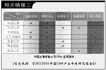 據(jù)某IT媒體2002年末的調(diào)研,只有不到1/5的中國保險公司擁有客戶關系管理系統(tǒng),但是近六成的保險公司計劃在近期內(nèi)實施CRM;另一份調(diào)查則顯示中國保險業(yè)過去3年的IT投入平均達到9.36億元,幾乎所有的保險公司都在從不同側(cè)面開展CRM建設。CRM在中國保險業(yè)的應用,到底是處于落伍還是冒進狀態(tài),成為一個意味深長的話題。
