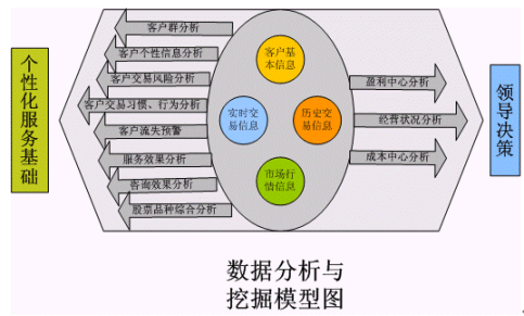 。。從上圖可以看出,在這個客戶信息數(shù)據(jù)分析模塊當中,主要分析對象是客戶的基本信息、客戶的實時交易信息、客戶的歷史交易信息、客戶帳戶信息和市場行情信息等幾個處于孤島形狀的信息模塊。而得到的分析結(jié)果應該包括如下幾個基本方面,以被為領(lǐng)導的決策和企業(yè)的業(yè)務流程服務: