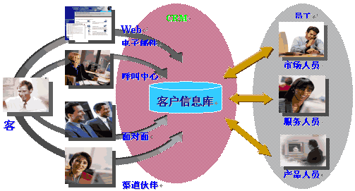 CRM是在90年代,隨著Internet的發(fā)展成熟起來。它充分利用了Internet技術(shù),通過電話中心、網(wǎng)站、電子郵件、移動(dòng)技術(shù)的使用,提供客戶多種形式的渠道,完成銷售、服務(wù)、市場等多種職能和流程,滿足客戶不同種類、不同層次的需求。這些渠道全方位地收集客戶信息,并通過集中的數(shù)據(jù)庫進(jìn)行管理和共享。而數(shù)據(jù)挖掘技術(shù)幫助企業(yè)進(jìn)一步分析客戶需求,提供決策支持。如下圖(資料來源:Siebel公司)。