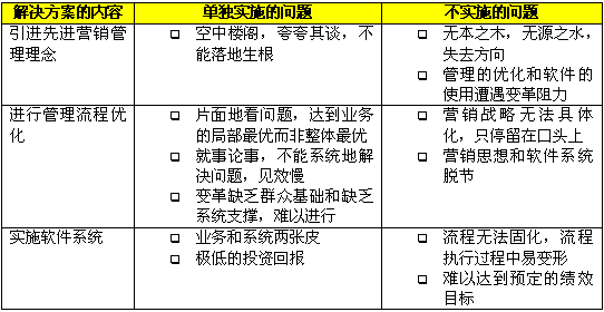 在CRM出現(xiàn)以前,企業(yè)為了解決市場、銷售和服務(wù)方面的問題,更好地吸引、獲得、保留和發(fā)展客戶,采取了各種方式,比如使用一套分銷管理的解決方案,或者請(qǐng)"點(diǎn)子公司"出謀劃策,或者尋求某個(gè)具體業(yè)務(wù)的優(yōu)化。以上這些做法往往只能完成局部的改進(jìn),或取得短期的效果,無法形成長期和整體的競爭優(yōu)勢。原因就在于這些解決方案都只提供了片面的、局部的解決方案,"頭痛醫(yī)頭,腳痛醫(yī)腳"不能綜合管理理念、業(yè)務(wù)流程和技術(shù)應(yīng)用這三個(gè)方面,系統(tǒng)地分析和解決問題。下表中分析了這些解決方案單獨(dú)實(shí)施或者不實(shí)施會(huì)帶來什么問題。