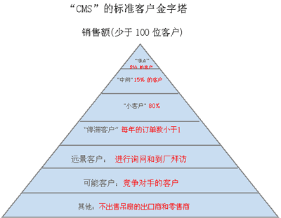 搜集了去年的銷售數(shù)量之后,“CMS”得出了以下的客戶金字塔。由于高端20%的核心客戶占總收入的80%,因此使用以上的方法來保留他們很重要。除此之外,對該公司來說通過獲取歐洲和南美地區(qū)的新客戶來增加客戶基數(shù)也是十分必要的。