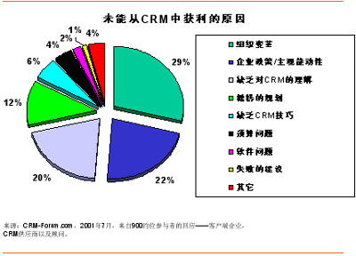 但成功只會擁抱那些能夠“正確執(zhí)行”的人,而不是任何一個搭上CRM順風船的企業(yè)。2001年7月,CRM-Forum.com出版了一份關(guān)于未能從CRM中獲利原因的報告。從搜集到的來自CRM開拓者的約900個回應來看——客戶端企業(yè),CRM供應商以及顧問,組織變革及企業(yè)政策/主觀能動性占了50%以上的失敗原因;緊隨其后的各個因素包括缺乏對CRM的理解(20%)和糟糕的規(guī)劃(12%)。下面讓我們就CRM方法論的選擇對這些因素作一番考察吧。
