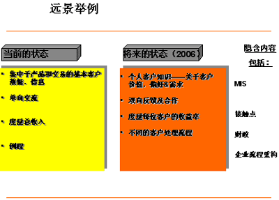 在評估當前情況與遠景,資源需求,癥結(jié),極限以及鋪就路標和里程碑的關(guān)系時,實施展望和差距分析會議是十分重要的。取決于你對CRM遠景的定義——無論是它將成為一個能夠給你一把競爭利刃的企業(yè)策略 (類似的例子有Citicorp,Dell,F(xiàn)ord Motors) 或僅僅只是一個讓你更出眾的營銷項目——這邁出的第一步在你選擇CRM方法論的過程中都必將起到舉足輕重的作用。一個核心的方法論必須能夠支持企業(yè)大部分的業(yè)務(wù)和流程需求,如MIS;客戶體驗管理;接觸點管理;收益率管理等等。