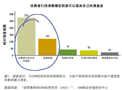 IBM商業(yè)價(jià)值研究中心的一項(xiàng)研究結(jié)果印證了筆者的設(shè)想。IBM 對美國10家零售商的消費(fèi)群進(jìn)行了調(diào)查,其中包括5家表現(xiàn)較好的(過去3年中在店面單位面積銷售和凈收入的增長方面做得很好)和5家表現(xiàn)較差的(業(yè)績持平或出現(xiàn)下滑)。調(diào)查發(fā)現(xiàn),領(lǐng)先的零售商能夠同時(shí)有效使用關(guān)鍵的滿意度推動(dòng)因素和關(guān)系要素,為消費(fèi)者提供最佳的“總體體驗(yàn)”,即一家公司(或一個(gè)品牌)有形、無形地給客戶留下的總體印象。該項(xiàng)調(diào)查的統(tǒng)計(jì)分析結(jié)果發(fā)現(xiàn)了5組滿意度推動(dòng)因素: