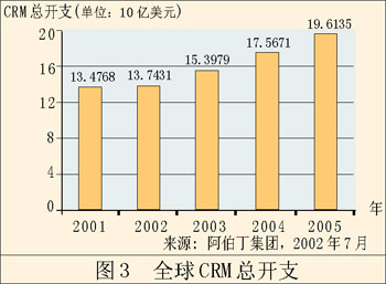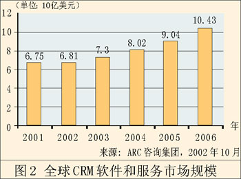 單單這還不是惟一能夠說明問題的。早在2002年,F(xiàn)orrester研究公司就聲稱,來自CRM的收入將從428億美元增長到738億美元。AMR研究公司同樣預(yù)測(cè),這個(gè)領(lǐng)域會(huì)不斷增長。AMR的調(diào)查表明,91%的公司會(huì)在這方面增加開支,預(yù)計(jì)總開支會(huì)增長8%。值得一提的是,AMR所指的這一塊市場(chǎng)是“客戶管理”,而不是較為傳統(tǒng)的CRM,這說明CRM應(yīng)用軟件的作用發(fā)生了轉(zhuǎn)變。