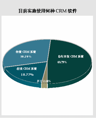 在選擇“已經(jīng)實施任一CRM軟件”的38.45%的被調(diào)查者中,有48.79%的CRM軟件使用者目前實施的是“自行開發(fā)CRM系統(tǒng)”,而選擇“傳統(tǒng)CRM系統(tǒng)”的為30.29%。雖然市場對on-demand