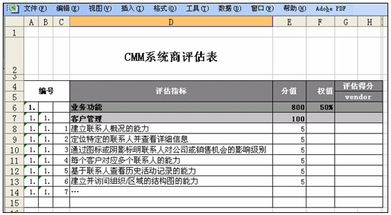 根據(jù)評估分?jǐn)?shù)值形成CMM評估表,為電子表格形式,帶有指標(biāo)編號和權(quán)重、分值,后面為實(shí)際評測分?jǐn)?shù)和備注,可以作為單獨(dú)的廠商系統(tǒng)評測,也可以作為橫向的多家廠商系統(tǒng)的水平評測。當(dāng)橫向的多家系統(tǒng)商評測時實(shí)際評測分?jǐn)?shù)欄為多家系統(tǒng)商評測分?jǐn)?shù)。