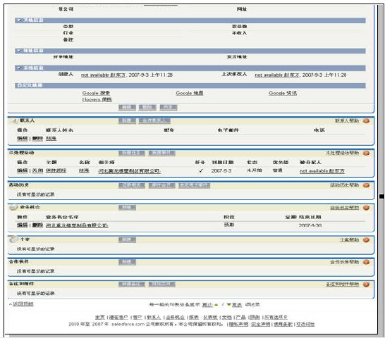 這種模式較之Salesforce界面切換式的操作,給人的感覺就像是液晶電視和CRT電視的感覺,差著技術(shù)時(shí)代!在Salesforce正式面向中國(guó)市場(chǎng)以前,筆者了解過(guò)Salesforce的英文版本,Ajax的應(yīng)用也是比較多的,但是為何其中文版本的人機(jī)交互卻使用了兩三千年的老技術(shù)?這個(gè)問(wèn)題也許只有Salesforce才可以回答。不過(guò)顯然,在這個(gè)項(xiàng)目的對(duì)決中,XToolsCRM大勝Salesforce。