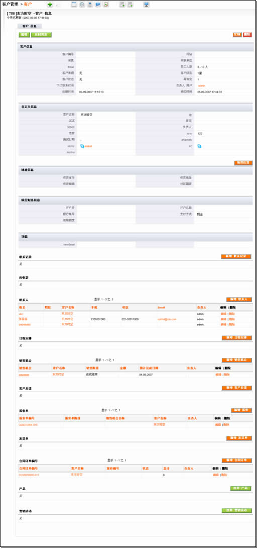 客戶基本信息、聯(lián)系記錄、應(yīng)收款、聯(lián)系人、日程、機(jī)會(huì)、客戶反饋、報(bào)價(jià)單、發(fā)貨單、合同訂單、營(yíng)銷活動(dòng)。從模塊的布局來(lái)看,還是動(dòng)了一番腦筋,其聯(lián)系記錄和應(yīng)收款在所有相關(guān)信息的最頂端;但是后面的模塊排列順序讓人費(fèi)解,像是沒(méi)有經(jīng)過(guò)縝密策劃,隨意放在一起的。
