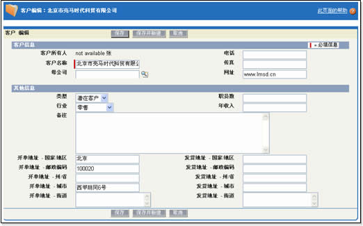 易客采用的窗口切換方式類似于Salesforce,在Ajax大行其道的今天,不能不說(shuō)這種方式的落后。不過(guò)令人欣慰的是,易客在客戶信息被保存后,修改個(gè)別字段時(shí)大量運(yùn)用了Ajax技術(shù),十分方便。這部分細(xì)節(jié)我們放在維護(hù)客戶部分描述。
