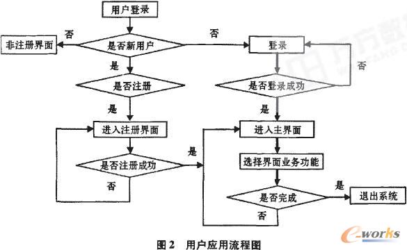 當(dāng)用戶(hù)與系統(tǒng)聯(lián)系時(shí),首先確定是否為注冊(cè)用戶(hù),如果是注冊(cè)用戶(hù),就可以通過(guò)客戶(hù)編碼和密碼登錄系統(tǒng),進(jìn)行業(yè)務(wù)的操作。否則,尋問(wèn)用戶(hù)是否需要注冊(cè),如果客戶(hù)拒絕注冊(cè),則可以進(jìn)入一般功能界面,如公司新聞、各項(xiàng)政策等。如果客戶(hù)同意注冊(cè)并且注冊(cè)成功,那么就可以進(jìn)入系統(tǒng)業(yè)務(wù)操作流程。然后用戶(hù)搬據(jù)自身的需求,對(duì)系統(tǒng)的具體功能模塊進(jìn)行操作,以達(dá)到與企業(yè)數(shù)據(jù)庫(kù)交互目的,從而實(shí)現(xiàn)業(yè)務(wù)操作的及時(shí)性和移動(dòng)性。具體如圖2所示。