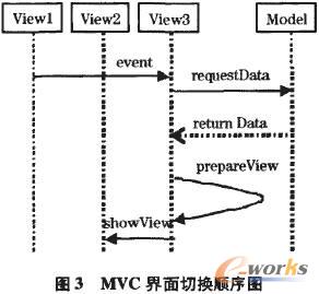 在界面設(shè)計(jì)上,使用MVC模式。MVC模式包括三類(lèi)對(duì)象,模型Model是應(yīng)媚對(duì)象,視圖View是它在屏幕上的表示,控制器定義了用戶(hù)輸入的響應(yīng)方式。MVC架構(gòu)使表現(xiàn)與邏輯分開(kāi),使得多個(gè)視圖可以共用同一個(gè)MVC模型。MVC界面切換順序圖如圖3。