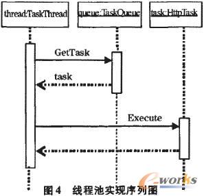 為解決頻繁創(chuàng)建線(xiàn)程導(dǎo)致的線(xiàn)程生命周期開(kāi)銷(xiāo)和資源消耗問(wèn)題,借鑒在網(wǎng)絡(luò)服務(wù)中常見(jiàn)的線(xiàn)程池技術(shù)。由于服務(wù)器需要處理大量的網(wǎng)絡(luò)請(qǐng)求,為避免大量的線(xiàn)程創(chuàng)建和銷(xiāo)毀所導(dǎo)致的問(wèn)題,通常使用線(xiàn)程池來(lái)處理網(wǎng)絡(luò)請(qǐng)求,即在線(xiàn)程池中預(yù)先創(chuàng)建一定數(shù)量的線(xiàn)程,當(dāng)新的網(wǎng)絡(luò)任務(wù)到達(dá)時(shí),由線(xiàn)程池中一個(gè)空閑線(xiàn)程執(zhí)行該任務(wù),任務(wù)執(zhí)行完畢后該線(xiàn)程并不銷(xiāo)毀,而是重新返回線(xiàn)程池中并等待新的任務(wù)到達(dá)。對(duì)于J2ME設(shè)備需要頻繁連接網(wǎng)絡(luò)的情況下,線(xiàn)程池不失為一個(gè)提高性能、節(jié)約系統(tǒng)資源的好方法。圖4給出了線(xiàn)程池實(shí)現(xiàn)的序列圖。