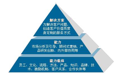 解決方案導(dǎo)向型企業(yè)在整個經(jīng)營過程中積極倡導(dǎo)上述觀念,并在向客戶的服務(wù)過程中身體力行,這需要企業(yè)具備哪些核心的能力,這些能力又該如何獲取呢?看看下圖中的解決方案型企業(yè)能力金字塔: