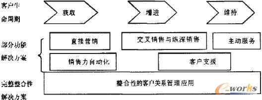 Kalakota and Robinson認為,客戶關(guān)系管理主要包括了三個不同的階段,分別為獲。ˋcquisition)、增進(Enhancement)與維持(Retention)。而這三個各異的部份,也正和客戶的不同生命周期階段不謀而合。