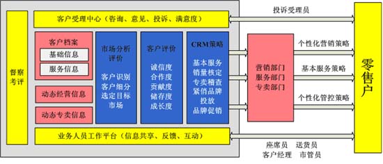 客戶管理:建立客戶全面檔案信息,提供客戶觀察器,對(duì)零售客戶的基本信息、網(wǎng)建信息、銷售信息、專賣信息等進(jìn)行360度分析查詢;對(duì)零售客戶進(jìn)行評(píng)價(jià)與分類,為差異化服務(wù)和“一對(duì)一營銷”提供依據(jù)。