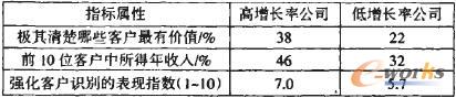 對(duì)《財(cái)富》雜志排名前l(fā)000位公司的200位經(jīng)理調(diào)查后得出結(jié)論,企業(yè)增長性與清楚的識(shí)別客戶有明顯的聯(lián)系(見表1)。該表反映了高增長率的企業(yè)比低增長率的企業(yè)更加懂得客戶識(shí)別的重要性,并運(yùn)用技巧來強(qiáng)化核心客戶為企業(yè)創(chuàng)造更多價(jià)值。