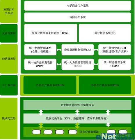 根據(jù)企業(yè)管理發(fā)展戰(zhàn)略及目標(biāo),需要考慮建設(shè)“集成化數(shù)字管控制造系統(tǒng)”,涵蓋企業(yè)決策層、企業(yè)經(jīng)營(yíng)管理層。根據(jù)整體業(yè)務(wù)模式,企業(yè)經(jīng)營(yíng)管理層又可以進(jìn)一步分解為公司管理層和工廠執(zhí)行層;從信息化戰(zhàn)略支撐角度可以分解為企業(yè)門(mén)戶(hù)交互層、應(yīng)用系統(tǒng)層、應(yīng)用集成層和網(wǎng)絡(luò)支撐層。實(shí)現(xiàn)企業(yè)信息流、資金流、物流、商物流的高度集成、統(tǒng)一,為企業(yè)生產(chǎn)、經(jīng)營(yíng)提供強(qiáng)有力的信息化支撐。