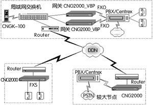 用這種方式組建IP語音系統(tǒng),各節(jié)點可根據(jù)接入的用戶數(shù)及通信話務(wù)量大小,靈活匹配一臺或多臺CNG-2000 IP接入網(wǎng)關(guān)。實際撥打時只需撥打配置好的號碼,撥號方式簡單。