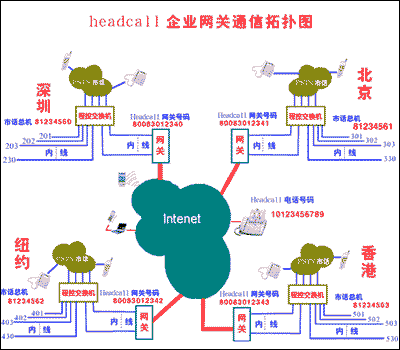 下面是集團(tuán)用戶利用HeadCall的語(yǔ)音網(wǎng)關(guān)的通訊拓樸圖: