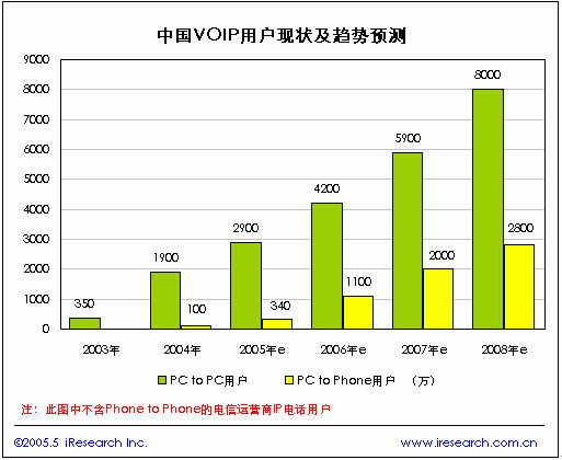 中國VOIP市場上PC to PC的VOIP電話主要是通過即時通訊軟件和語音聊天室來實現(xiàn)的,目前這部分服務絕大多數(shù)是免費的,尚未給服務公司帶來直接的經濟收入。根據(jù)iResearch的統(tǒng)計數(shù)據(jù),2004年中國PC to PC的VOIP電話用戶達到1900萬,2005年有望達到2900萬。由于信息產業(yè)部在2003年2月發(fā)布的《電信業(yè)務分類目錄》中規(guī)定IP電話屬于第一類基礎電信業(yè)務,但“IP電話業(yè)務在此特指由電話網絡和IP網絡共同提供的Phone-Phone以及PC-Phone的電話業(yè)務”,這與目前虛擬運營的Phone to Phone 、PC to Phone的寬帶電話略有不同,盡管如此這一規(guī)定對提供Phone to Phone 和PC to Phone的非電信運營商有著非常大的制約,目前在我國提供“到電話”的VOIP服務除部分基礎電信運營商試驗外多為暗中操作,存在較大的風險不能通過大規(guī)模的市場推廣來迅速吸引用戶,因此PC to Phone的VOIP電話用戶增長速度將相對平穩(wěn),據(jù)iResearch預測,2008年中國的PC to Phone的VOIP電話用戶將達到2800萬戶。