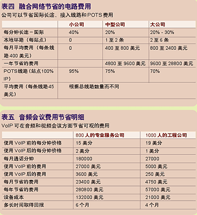 據(jù)研究顯示,當(dāng)公司融合它們的網(wǎng)絡(luò)后,將電信費(fèi)用減少了25%到60%。(見(jiàn)表四)這筆費(fèi)用包括每分鐘長(zhǎng)途、本地環(huán)路、普通電話服務(wù)(POTS)線路和音頻/視頻服務(wù)。