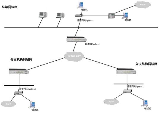 首先將VOIP電話(huà)網(wǎng)關(guān)的網(wǎng)絡(luò)接口接入到公司和分部(分公司)的局域網(wǎng)中,通過(guò)ADSL、ISDN、撥號(hào)上網(wǎng)等方式,同連接在此因特網(wǎng)上的其它VOIP電話(huà)網(wǎng)關(guān)相連,從而將不同地域的電話(huà)連接在一起,組成整個(gè)公司的IP電話(huà)網(wǎng),如果總部或分部有用戶(hù)程控交換機(jī),還可以將VOIP電話(huà)網(wǎng)關(guān)接入程控交換機(jī),使得整個(gè)交換機(jī)的分機(jī)都能利用IP網(wǎng)絡(luò)撥打免費(fèi)電話(huà)。如果這個(gè)VOIP設(shè)備具有PBX的功能。那么電話(huà)網(wǎng)關(guān)的多種接口還可以與電信(PSTN)相連,從而將專(zhuān)網(wǎng)的IP電話(huà)語(yǔ)音網(wǎng)與整個(gè)公網(wǎng)銜接成一個(gè)大的電話(huà)網(wǎng)絡(luò)。