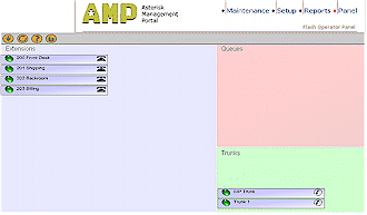 在AMP中,有四個(gè)主要的部分――維護(hù)、設(shè)置、報(bào)告和面板。我們還沒開始進(jìn)行設(shè)置呢,則設(shè)置標(biāo)簽是我們要最先來(lái)訪問的,它的主要功能是維護(hù)管理呼入和呼出,包括設(shè)置中繼、數(shù)字話務(wù)員、語(yǔ)音信箱,甚至還可處理響鈴后播放的音樂(類似于現(xiàn)在手機(jī)上的彩鈴噢)。