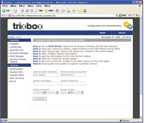 以往,我們使用一臺(tái)基于FreeBSD和Asterisk 1.2.4的PC機(jī)完成這個(gè)功能,在測(cè)試過程中,我們使用Trixbox,經(jīng)過簡(jiǎn)單配置,很快就實(shí)現(xiàn)了原有功能。