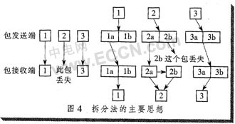 如果某個(gè)RTP包在傳輸過程中丟失,那么丟失的只是原數(shù)據(jù)包按采樣間隔的一半信息,接收端可以用接受到的另一半信息,利用插值等方法恢復(fù)出原話音包的大部分信息,從而使話音質(zhì)量不至于下降太多。拆分法的主要思想如圖4所示。