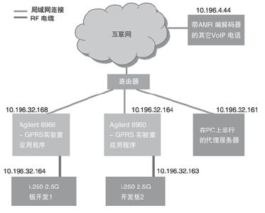 8960 ,將GRPS實(shí)驗室應(yīng)用測試集用作媒介,將 i.250 2.5G 開發(fā)板卡 (ADS板卡)連接到互聯(lián)網(wǎng)。ADS板卡在接通電源時,注冊登錄到GPRS網(wǎng)絡(luò),測試集然后通過路由器連接到互聯(lián)網(wǎng)。測試集充當(dāng)連接到GPRS的DUT的橋梁,讓它們接入互聯(lián)網(wǎng)。一旦GPRS上下文激活,測試集將為ADS分配一個固定IP地址。此外,在PC上運(yùn)行的代理服務(wù)器也連接到同一個路由器。通過這種安排,確保三個實(shí)體都能在同一網(wǎng)段內(nèi)運(yùn)行。這樣就能對同一個網(wǎng)段內(nèi)的分組流量進(jìn)行監(jiān)控,用于開發(fā)目的。