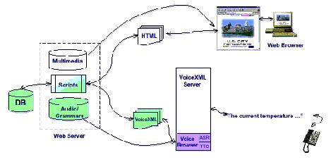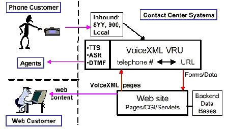 從圖中我們可以看出,同傳統(tǒng)的INTERNET網(wǎng)站相比,在不需要太大的改動(dòng)前提下,只要增加一個(gè)VoiceXml的服務(wù)器處理來自PSTN的應(yīng)用即可。在VoiceXml的服務(wù)器中,包含了VoiceXml的解釋器(VoiceXml解釋程序語境),VoiceXml自帶的瀏覽器,自動(dòng)語音識(shí)別(ASR)及文本到語音(TTS)的轉(zhuǎn)換設(shè)備。
