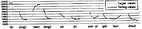 神經(jīng)網(wǎng)絡(luò)韻律模型同樣輸出了較好的音節(jié)音長參數(shù),圖5很好地反映出了語句音長的變換趨勢。由于在自然語句中,音節(jié)音長參數(shù)對控制音節(jié)發(fā)音的節(jié)奏和輕重起著非常重要的作用。我們對所有測試結(jié)果進(jìn)行的統(tǒng)計表明,81%的音節(jié)輸出誤差在0~50ms,約14%的音節(jié)輸出誤差在50~120ms,而只有約5%的音節(jié)輸出誤差會超過120ms。從音長改變的百分比上看:89.8%的音節(jié),其音長輸出誤差占目標(biāo)音長的百分比在0~20%之間;另外,9%的音節(jié)輸出誤差百分比在20%~50%之間,而只有1.2%的音節(jié)輸出誤差百分比會超過50%。因此,該模型的音長參數(shù)輸出結(jié)果基本上滿足了較高質(zhì)量韻律控制參數(shù)的要求。