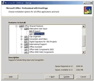 如果是首次使用手寫識(shí)別,那么需要通過(guò)執(zhí)行自定義安裝來(lái)安裝本功能。注意無(wú)法從"工具"中找到類似"語(yǔ)音"的"手寫"命令,你只能通過(guò)插入Office XP光盤的方法進(jìn)行自定義安裝,其安裝步驟與安裝自定義安裝語(yǔ)音識(shí)別功能一致,不過(guò)這次是從"Office 共享功能"旁,單擊"中文可選用戶輸入方式"旁,單擊"手寫輸入"(如圖15所示)。