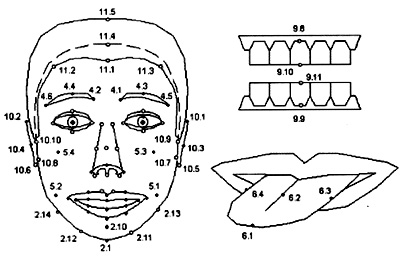 現(xiàn)在運行的系統(tǒng)中多為參數(shù)控制系統(tǒng),其中控制參數(shù)也多采用MPEG-4所定義的人臉動畫參數(shù)(facial animation parameter,FAP)。MPEG-4制定了一整套人臉模型化描述方法,包括用于定義人臉模型的面部定義參數(shù)(facial define parameters,FDP)和一組用于定義人臉面部動作的人臉動畫參數(shù)FAP。其中FDP通過對人臉上84個特征點的位置信息來定義人臉模型,這些點不僅包括外表看得見的人臉特征點,還包括了舌頭、牙齒等口腔內(nèi)器官的特征點,如圖1所示。