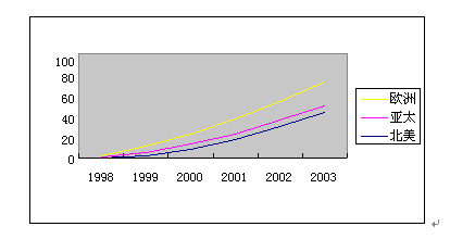 圖4顯示了UM產(chǎn)品和服務(wù)從1998到2003年的收入增長(zhǎng)預(yù)測(cè)。UM產(chǎn)品和服務(wù)市場(chǎng)在2003年的總體收入預(yù)計(jì)為100億美元左右。圖5顯示統(tǒng)一消息郵箱的三個(gè)UM市場(chǎng)(北美、歐洲和亞太地區(qū))增長(zhǎng)預(yù)測(cè)。
