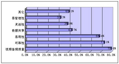 對于視頻會議系統(tǒng)需求特征,我們調(diào)查發(fā)現(xiàn),視頻音頻質(zhì)量、可靠性、易用性排在前三位,數(shù)據(jù)共享、靈活性、易管理性也得到應有的關(guān)注和重視,如圖4所示。