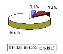 如圖5所示,目前僅僅存在少量單一H.320產(chǎn)品,雙模式產(chǎn)品在市場中占據(jù)著主導地位,單一的H.323模式主要由桌面會議系統(tǒng)占據(jù),市場份額穩(wěn)步增長。