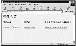 如果在前面已設(shè)置了提醒功能,那么在臨近會議前屏幕上將出現(xiàn)提醒窗口。教師機(jī)和學(xué)生機(jī)有三種方法可以參加會議:點擊提醒窗口中[參加會議]按鈕;或者不等提醒,直接點擊會議邀請函中的鏈接打開會議網(wǎng)頁;最好的方式還是打開IE,輸入網(wǎng)址http://x/conferencing/list.asp進(jìn)入會議(x為Exchange服務(wù)器的IP地址或計算機(jī)名),如圖3。