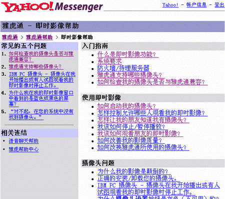 選擇工具->開啟我的攝像頭后,就會彈出“我的即時(shí)影像”窗口(圖4),如果你的攝像頭安裝連接正常,可以馬上從這個(gè)窗口中看到你的影像;如果你的攝像頭正常,但在窗口中卻沒有看到影像,你可以在聯(lián)網(wǎng)的情況下選擇當(dāng)前窗口中的幫助->即時(shí)影像幫助進(jìn)入相關(guān)網(wǎng)頁(圖5)對你的攝像頭進(jìn)行雅虎通的兼容性測試,或者尋求更為詳細(xì)的幫助。