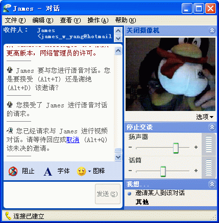單擊對話框右邊的“啟動(dòng)攝像機(jī)”和“開始交談”,系統(tǒng)會提示你正在等待對方回應(yīng)視頻或語音對話的邀請,對方接受,就開始進(jìn)行視頻通話(見圖11)。如果雙方都有攝像頭,你還可以通過視頻框下面的“選項(xiàng)”將自己的影像設(shè)為畫中畫的功能。