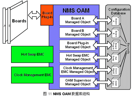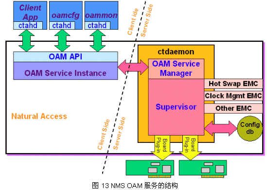 NMS公司的OAM組件是作為Natural Access服務(wù)提供給用戶的,用以管理一個(gè)機(jī)架甚至多個(gè)機(jī)架上的NMS板卡和軟件模塊。OAM即操作(Operation)、管理(Administration)、維護(hù)(Maintenance),通過OAM可以創(chuàng)建、刪除、查詢OAM下的各組件的配置,啟動(dòng)、終止或測(cè)試組件的運(yùn)行,以及接收從組件發(fā)出的告警等事件通知。