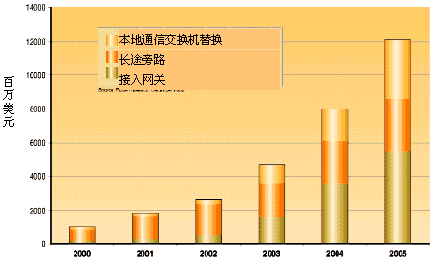 隨著因特網(wǎng)業(yè)務(wù)的普及,與傳統(tǒng)電信業(yè)務(wù)供應(yīng)商形成競(jìng)爭(zhēng)、替代局面的新業(yè)務(wù)供應(yīng)商看到了重大的機(jī)會(huì):利用通過包網(wǎng)絡(luò)傳送話音(VoP)業(yè)務(wù)取代分離的話音/數(shù)據(jù)網(wǎng)業(yè)務(wù)。VoP技術(shù)最初主要用于長途旁路。在過去的兩年里,VoP網(wǎng)絡(luò)的發(fā)展勢(shì)頭明顯加快,通過寬帶網(wǎng)傳送話音的接入網(wǎng)關(guān)正在推廣,利用VoP本地網(wǎng)關(guān)代替?zhèn)鹘y(tǒng)中心局交換機(jī)的機(jī)會(huì)也已出現(xiàn)。圖1用圖例說明了VoP在交換機(jī)替換、長途旁路和接入網(wǎng)關(guān)方面市場(chǎng)的分塊大小以及對(duì)末來的預(yù)測(cè)。