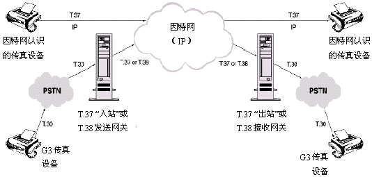 在T.37術語中,因特網(wǎng)傳真(Ifax)設備能夠通過一個出站設備向傳統(tǒng)連接到PSTN的傳真機發(fā)傳真,或者通過一個IP網(wǎng)直接發(fā)送到另一個因特網(wǎng)傳真(Ifax)設備。