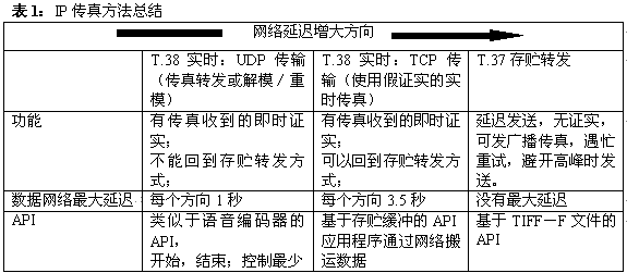 IP傳真方法的一個總結顯示于表1之中。通過選擇功能、業(yè)務需求以及所用網(wǎng)絡的延遲,就能得出最適合指定應用的傳真方法。