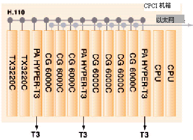 HYPER-T3接入適配板,它用于通過T3線上的1344個端口從PSTN接入語音和傳真媒體。這些媒體會從DS3轉(zhuǎn)換到DS0,然后通過H.110總線發(fā)送給6塊CG6000C中的一塊。CG6000C會壓縮這些語音和傳真媒體,然后用UDP/IP上實(shí)時協(xié)議(RTP)對它們進(jìn)行打包。再通過板上的兩個以太網(wǎng)接口發(fā)送到一個語音級的IP包網(wǎng)絡(luò)上。請注意,每種板都使用了N+1板卡級的冗余備份。