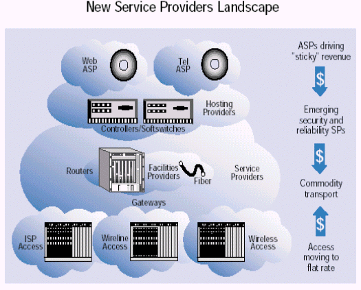 任何一個網(wǎng)絡(luò)的核心都是光纜和讓網(wǎng)絡(luò)工作起來的底層交換設(shè)備。傳統(tǒng)的業(yè)務(wù)提供商就是那些擁有這種底層設(shè)備的公司。但是打破傳統(tǒng)的語音環(huán)境為那些沒有這些底層設(shè)備的組織打開了向商業(yè)客戶和消費(fèi)者提供服務(wù)的大門。這種趨勢--網(wǎng)絡(luò)傳輸從電路交換轉(zhuǎn)變?yōu)榉纸M交換以及隨時可得的基于開放部件的劃算的業(yè)務(wù)平臺--使得這些新的業(yè)務(wù)提供商為自己的業(yè)務(wù)找到了商業(yè)機(jī)遇。